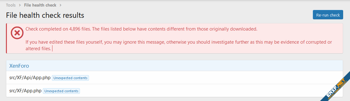Note: If you decide to patch the files instead of doing full upgrades, your "File health check" will report these files as having "Unexpected contents". Because these files no longer contain the same contents your version of XF was shipped with, this is expected and can be safely ignored.